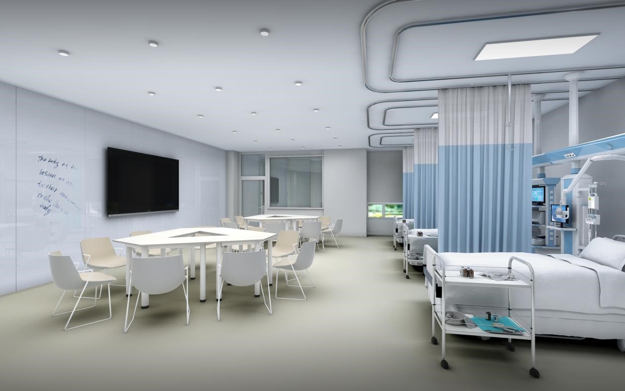 地下一层考试中心30站和中控室及配套用房,是目前单体量较大的智能化OSCE考试中心;地上一层设置应急处置中心、急救技能实训室、模拟ICU、观摩室、妇儿技能实训室和外科技能实训室。现实训中心已经正式运营并多次举办临床技能考核,其中圆满承接了2021年第十届全国大学生医学技能竞赛。